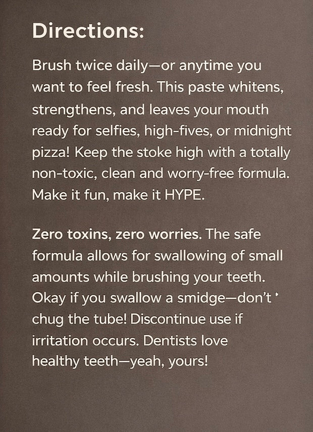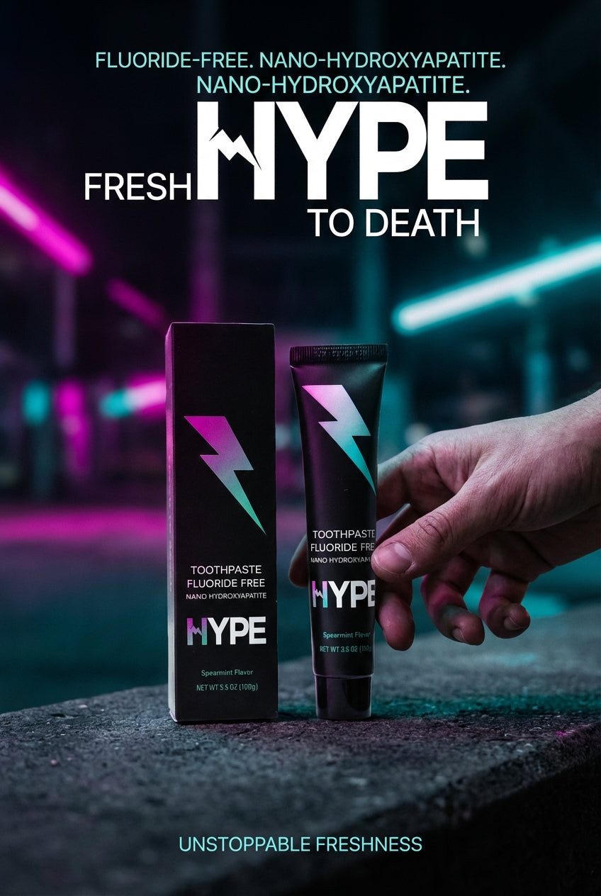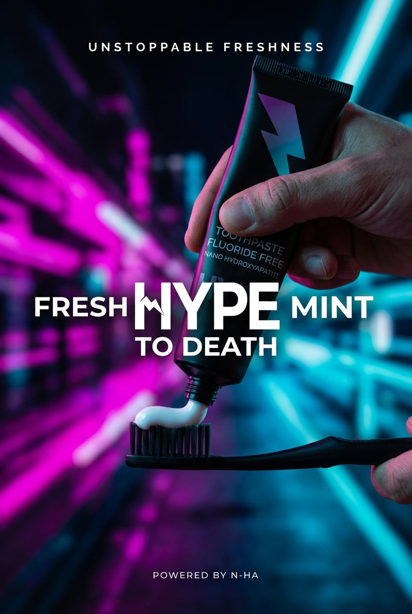 Unleash your inner beast and keep your smile as bold as your next big move. HYPE Mint Toothpaste is the all-natural, fluoride-free formula packed with nanohydroxyapatite (n-HA) – the ultimate enamel defender trusted by pros. Designed for extreme teens who live life on the edge, HYPE keeps your teeth strong, your breath cool, and your vibe untouchable – no toxic junk, just unstoppable freshness.